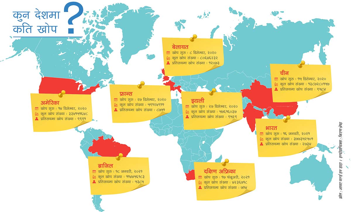 विश्वका सबै वयस्क नागरिकले खोप पाउने लक्ष्य राखिएको छ भने यसलाई इतिहासमै सबैभन्दा ठूलो खोप कार्यक्रमको रूपमा पनि हेरिएको छ। चीन र भारतमा हालसम्म सबैभन्दा बढी मात्रामा खोप लगाइएको तथ्यांक छ। चीनमा १.४ अर्ब र भारतमा ३७ करोडले खोप लगाइसकेका छन्। आफ्ना नागरिकमाझ खोप पु¥याउनेमा अमेरिका तेस्रो स्थानमा रहेको छ। अमेरिकामा हालसम्म ३३ करोडभन्दा बढी नागरिकले खोप लगाइसकेका छन्।